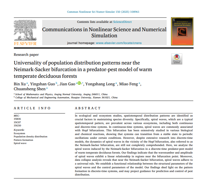 近日,3044AM永利集团2023级数学学科硕士研究生许斌以第一作者和导师团队在国际学术期刊《Communications in Nonlinear Science and Numerical Simulation》发表论文“Universality of population distribution patterns near the Neimark-Sacker bifurcation in a predator-pest model of warm temperate deciduous forests”,导师高见副教授为该文通讯作者,该期刊影响因子为3.8,JCR一区期刊,中科院一区期刊。