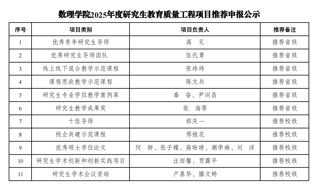 根据学校《关于组织开展2025年度新时代育人质量工程项目(研究生教育)申报工作的通知》精神和要求,经个人申报、学院学位评定委员会评议、学院党政联席会议审定,拟推荐高见等申报2025年度研究生教育质量工程项目,具体推荐结果公示如下: