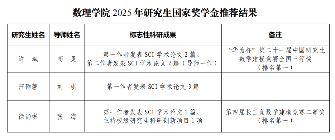 根据《3044am永利集团硕士研究生国家奖学金评审办法》《学校关于做好2025年度研究生国家奖学金评审工作的通知》等文件精神和要求,经研究生个人申请、公开答辩、3044AM永利集团研究生国家奖学金评审委员会评议投票、3044AM永利集团党委会和党政联席会议审定,拟推荐2023级研究生许斌(学号:Y23060034)、2024级研究生汪雨馨(学号:Y24060028)和2023级研究生徐尚彬(学号:Y23060044)为获得3044AM永利集团2025年度研究生国家奖学金人选,现公示如下: