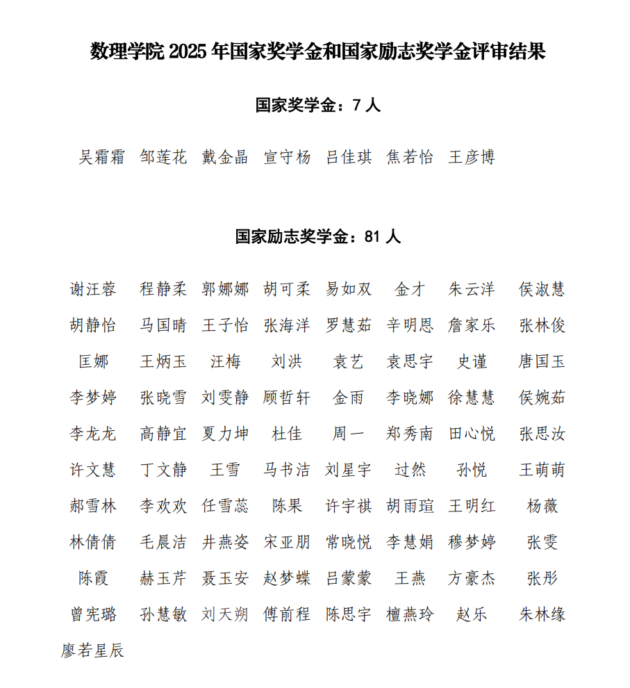 根据学校《关于做好2025年国家奖学金、国家励志奖学金和国家助学金评审工作的通知》要求,经学生个人申请、班级评议小组评议、学院学生工作委员会审议、学院党委会和党政联席会议审定,拟推荐吴霜霜等7名本科生荣获2025年本科生国家奖学金,谢汪蓉等81名本科生荣获2025年本科生国家励志奖学金,现将3044AM永利集团2025年国家奖学金和国家励志奖学金评审结果予以公示(具体见附件)。