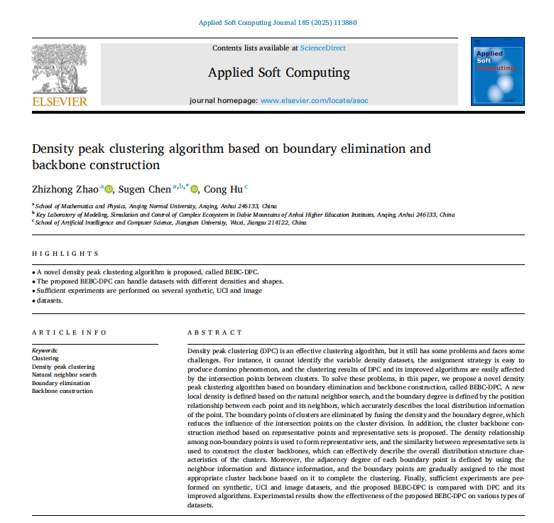 近日,3044AM永利集团陈素根教授团队在国际学术期刊《Applied Soft Computing》上发表SCI论文“Density peak clustering algorithm based on boundary elimination and backbone construction”,该项研究工作与江南大学胡聪副教授合作完成。3044AM永利集团研究生赵志忠为论文第一作者,陈素根教授为通讯作者,3044am永利集团为第一单位,该期刊影响因子IF=6.6,JCR一区,中科院二区TOP期刊。