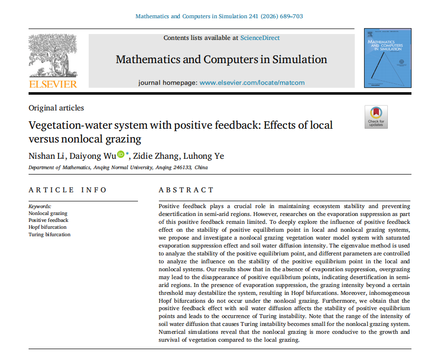 近日,3044AM永利集团2023级数学学科硕士研究生李妮姗以第一作者和导师团队在国际学术期刊《Mathematics and Computers in Simulation》发表SCI论文“Vegetation-water system with positive feedback: Effects of local versus nonlocal grazing”,导师伍代勇教授为该文通讯作者,该期刊影响因子为4.4,JCR一区期刊,中科院二区Top期刊。